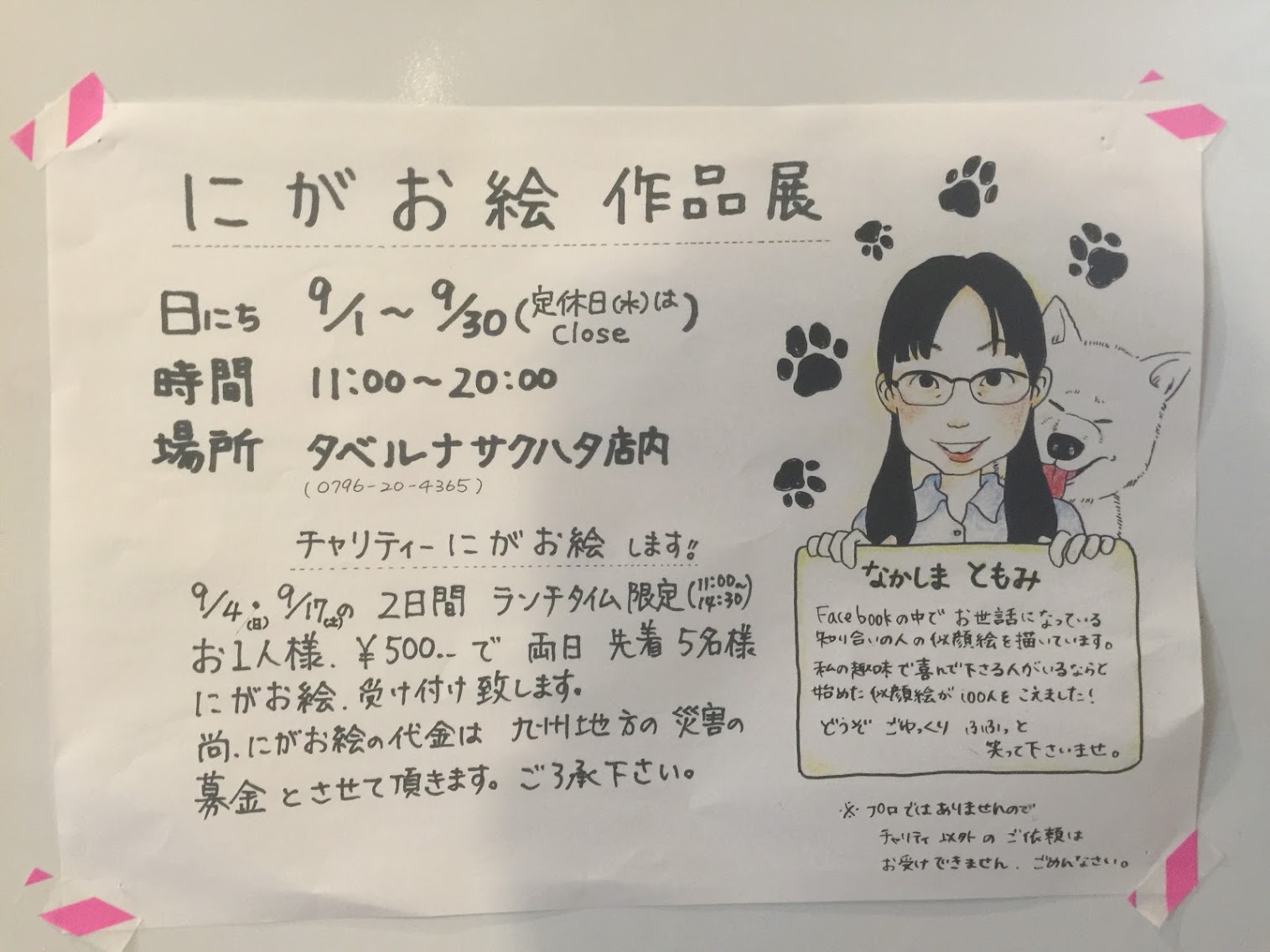 展示は9月末まで。似顔絵を描いてもらえるのは17日のランチタイムです!!