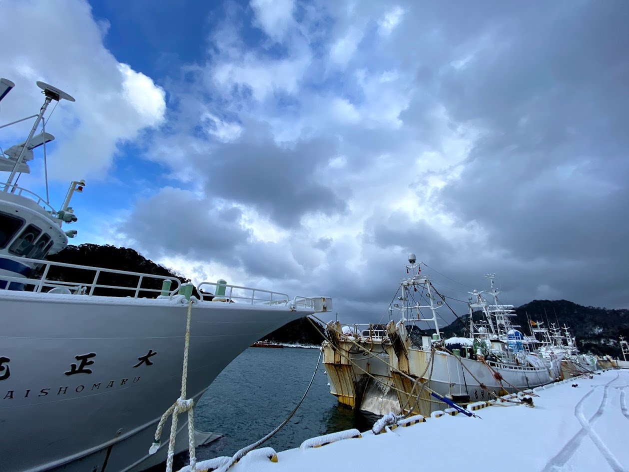 とはいっても、カニ漁は例年通り行われています。といっても、先日の大雪時は流石に波が5mを超える大しけ。大型船を有する柴山港も船が全部帰ってきて係留中でした。