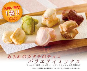 1袋の中にミルク・抹茶・きな粉・いちご・カフェオレの5種類が100g入ったお買い得品です。これでなんと、税込500円!!