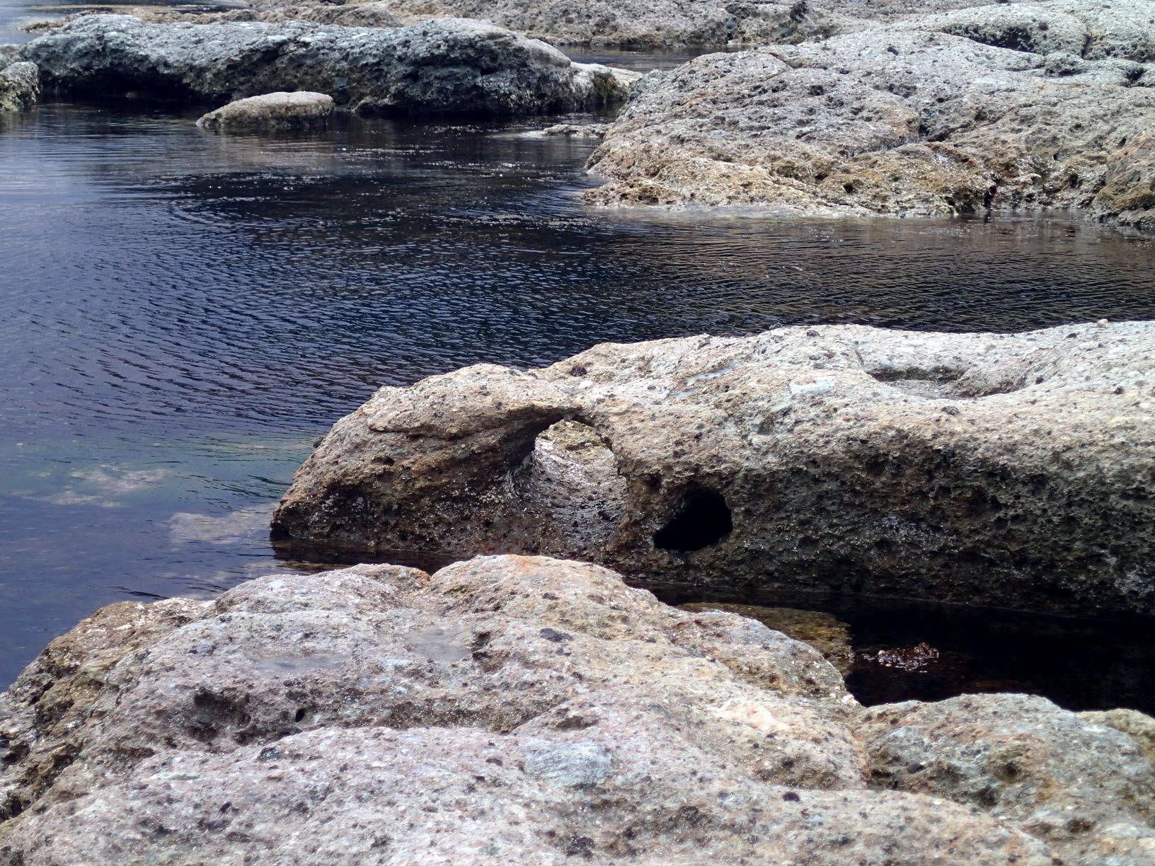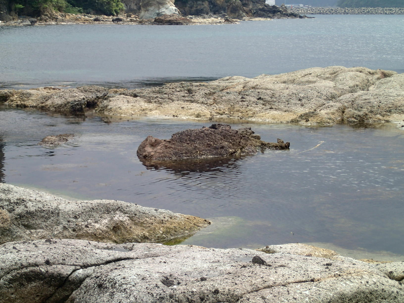 千畳敷(=凝灰岩)の真ん中に黒い安山岩が。