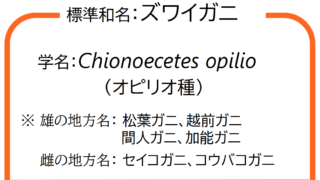 ズワイガニ(オピリオ種)は、地方名が豊富なのです。松葉ガニは山陰地方全域、越前ガニは福井県、間人ガニは京都府の丹後エリア、加能ガニは石川県と、あくまで地域名称であり、全て同じズワイガニ(オピリオ種)です。ここにオオズワイガニ(バルタイ種)という新たなズワイガニ属のカニが登場して話をややこしくしています。
