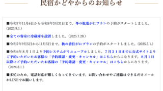 宿の選び方 この日は満室?休館日?それともまだ販売開始していない? 先日、11月の販売はいつになったらされるのですか?というお問い合わせをいただきました。多くの日が満室になってきますと、「まだ販売がスタートしていないんじゃないか」と誤認されることも確かにありそうです。当館の場合、時期シーズンの予約がスタートした際には、公式サイトトップのお知らせに掲載するようにしています。 2025.10.13 宿の選び方