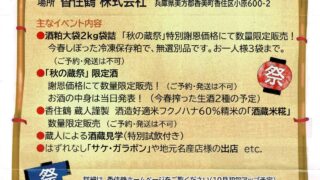 お酒 2024年香住鶴さんの秋の蔵祭は10月19日と20日の土日です! 毎年春と秋に開催される香住鶴さんの蔵祭の日程が分かりましたのでご案内申し上げます。秋の蔵祭、令和6年10月19日(土)と10月20日(日)、共に9:15から15:30まで開催されます。 2024.09.29 お酒イベント