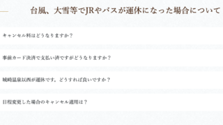 ご挨拶・ご報告 よくある質問に「台風、大雪等でJRやバスが運休になった場合について」の項目を新設しました! JRや長距離バスも含め、公共交通機関が運休となった場合の対応等、民宿かどや公式サイト「よくある質問(民宿かどやQ&A)に新たな項目として新設させていただきました。 2026.01.25 ご挨拶・ご報告よくあるお問い合わせ