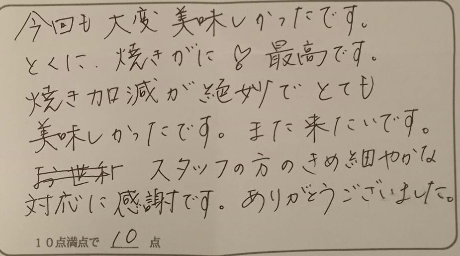 今年も大変美味しかったです。とくに、焼きがに!最高です。焼き加減が絶妙でとても美味しかったです。また来たいです。スタッフの方のきめ細やかな対応に感謝です。ありがとうございました。