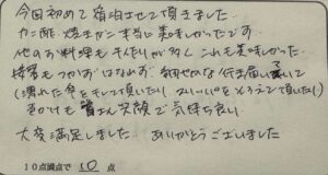 K様。この度は民宿美味し宿かどやをご利用いただきまして、誠にありがとうございました。あいにくの雨でしたが、田舎ののどかな風景と共に、カニ料理をお楽しみいただけましたでしょうか。特別なおもてなしはできませんが、民宿らしいフレンドリーな対応を心がけています。気楽な気持ちでまたお越しいただけたらと思います。のんびり蟹と温泉をお楽しみ頂きたい時はぜひかどやを思い出して下さいね。またのお越しをお待ちしております。ありがとうございました。