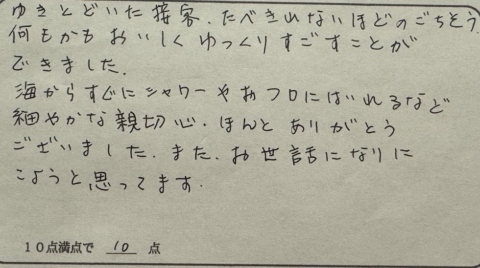 ゆきとどいた接客、たべきれないほどのごちそう、何もかもおいしくゆっくりすごすことができました。海からすぐにシャワーやおフロにはいれるなど、細やかな親切心、ほんとありがとうございました。また、お世話になりにこようと思ってます。