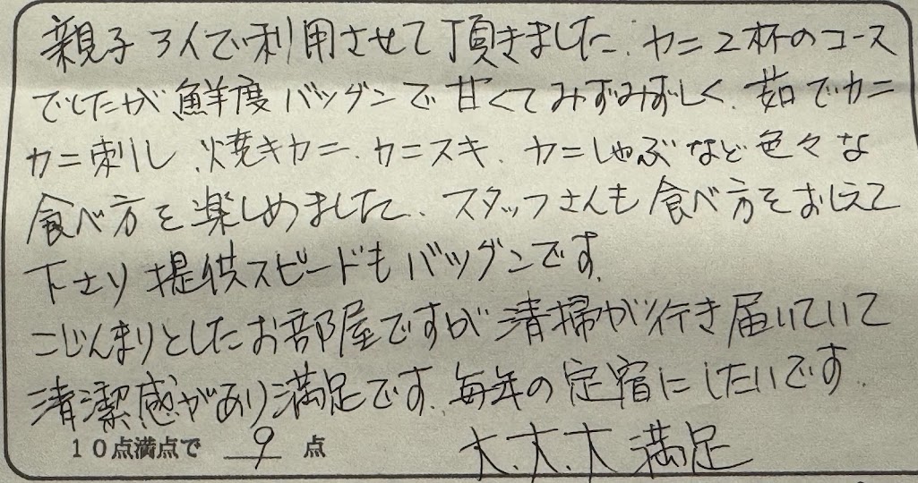 H様。この度は民宿美味し宿かどやにご来館いただきまして、誠にありがとうございました。香住がにの美味しさ、堪能していただけたようで、とても嬉しいです。どの食べ方が一番美味しかったでしょうか。小さな宿ですが、いわゆる「カニ宿」ですので、カニの美味しさは自信を持って提供させていただいております。ぜひ、定宿としていただき、これからもお越し下さいね。次回のお越しをお待ちしております。ありがとうございました。