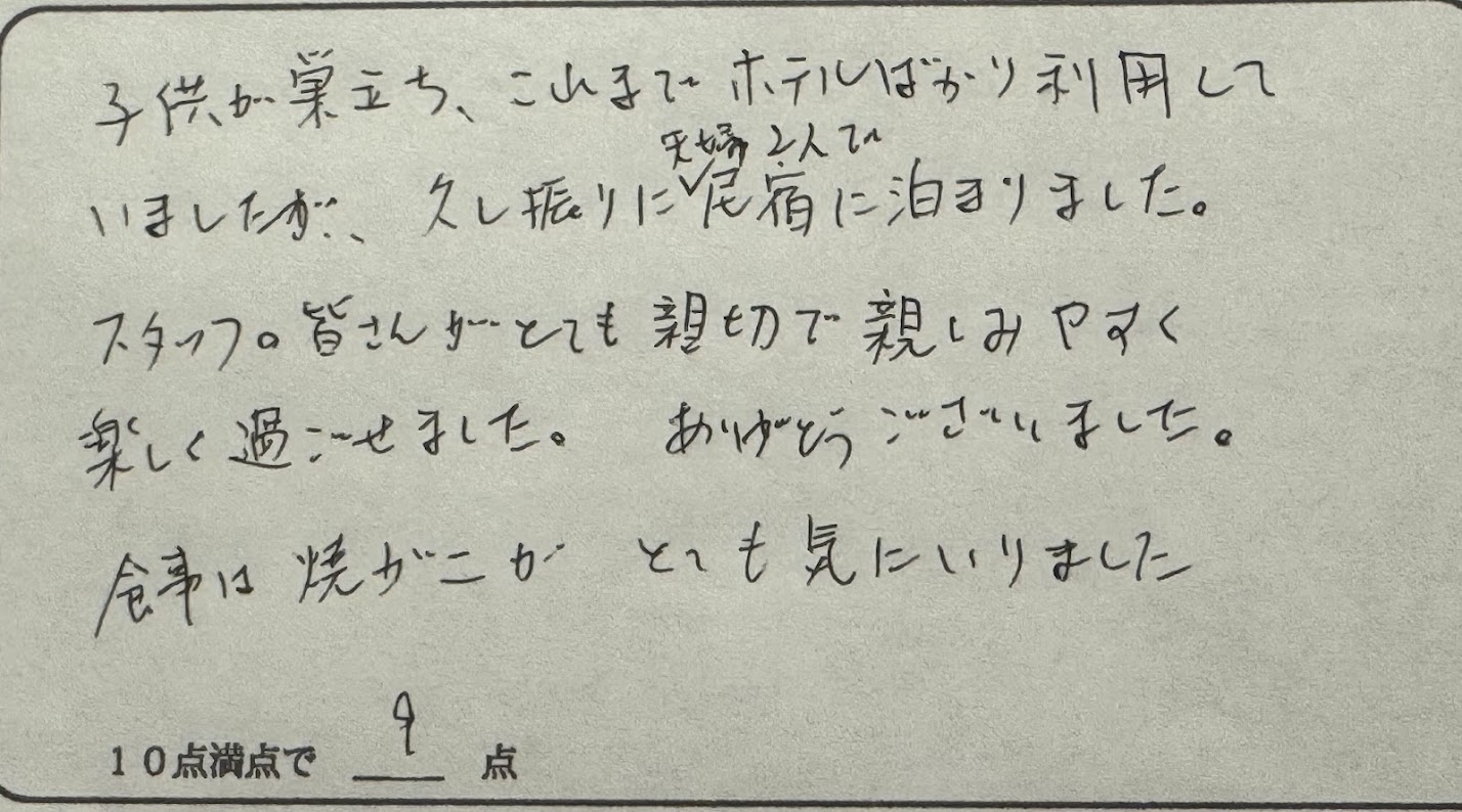 I様。この度は民宿美味し宿かどやにご来館いただきまして、誠にありがとうございました。のんびりとご夫婦でのカニグルメ旅行。ホテルよりも民宿や旅館の方が風情があるのではないか、と自負しています。カニ三昧の旅情をぜひぜひまた楽しみにお越しいただけることを期待しております。美味しいカニをご用意してお待ちしておりますね。またのお越しをお待ちしております。ありがとうございました。