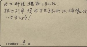 N様。この度は民宿かどやにお越しただきまして、誠にありがとうございました。一気に寒くなり、鍋を中心に蟹がより美味しく感じられる季節になってまいりました。ご満足いただけたようで良かったです。JRの減便、本当に残念です。何とか、お客様にとって使い勝手の良い時間帯の便が復活してくれることを望みます。頑張ります!!またのお越しをお待ちしております。ありがとうございました。