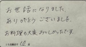 K様。この度は民宿かどやをご利用いただきまして、誠にありがとうございました。秋のカニ、香住がにのフルコース、ご満足いただけたようで良かったです。春秋と冬、カニの種類は変わりますが、1年のうち9ヶ月はカニのフルコースをご賞味いただけるのが当地、当館です。カニ料理が食べたくなったら、ぜひまた当館を思い出して下さいね。またのお越しをお待ちしております。ありがとうございました。