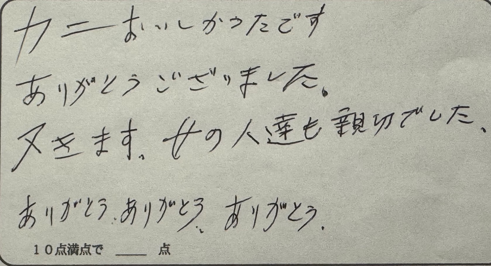 カニおいしかったです。ありがとうございました。又きます。女の人達も親切でした。ありがとう、ありがとう、ありがとう。