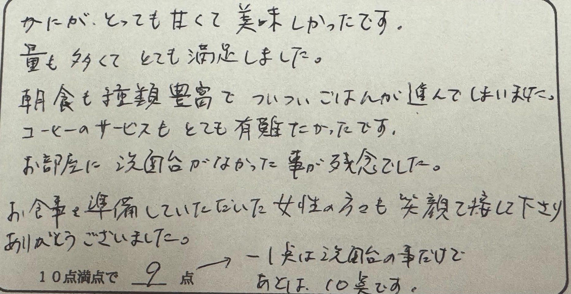 かにが、とっても甘くて美味しかったです。量も多くてとても満足しました。朝食も種類豊富でついついごはんが進んでしまいました。コーヒーのサービスもとても有難たかったです。お部屋に洗面台がなかった事が残念でした。お食事を準備していただいた女性の方々も笑顔で接して下さりありがとうございました。