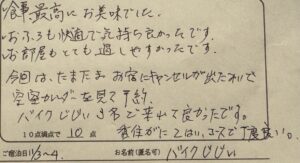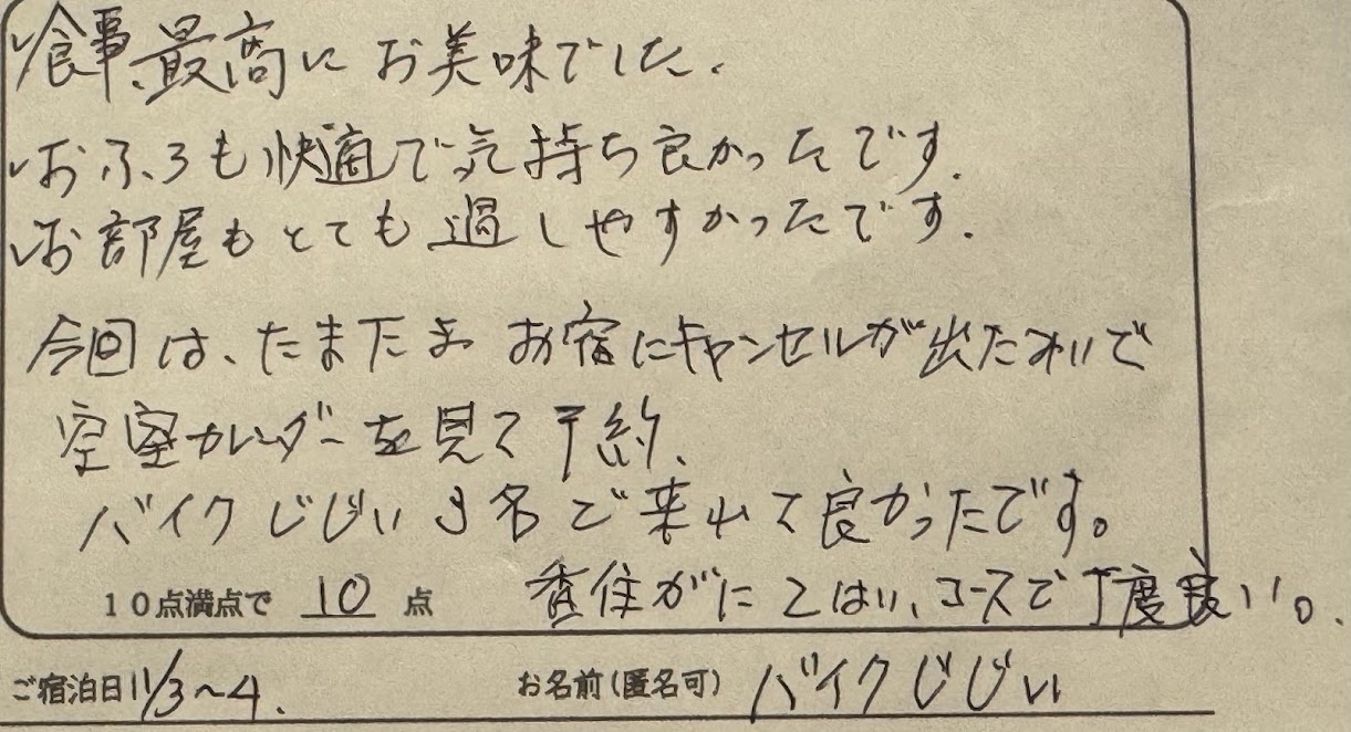 バイクじじぃ様。いつも民宿美味し宿かどやにご来館いただきまして、誠にありがとうございます。香住ガニ、堪能いただけましたでしょうか。今回はバイクツーリングでのカニ旅行、初日は道中で雨にあたられたかもしれませんが、翌朝は快晴!!絶好のドライブ日和だったのではないでしょうか。11月3か、晴れの特異日が今回は1日ずれましたね。今回はバイクでお越しいただきましたが、カニ旅行といえば、当館をご利用いただけること、いつも嬉しく思います。引き続き、またのご利用をお待ちしております。ありがとうございました。