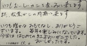 Y様。いつも民宿美味し宿かどやにご来館いただきまして、誠にありがとうございます。今回は初めての紅ズワイガニ。満足していただけたようでよかったです。「どっちの方が美味しい」ではなく、どちらの味もそれぞれその個性を愉しんでいただけると嬉しいです。次は松葉ガニの時期にお待ちしております。またのお越しをお待ちしております。ありがとうございました。
