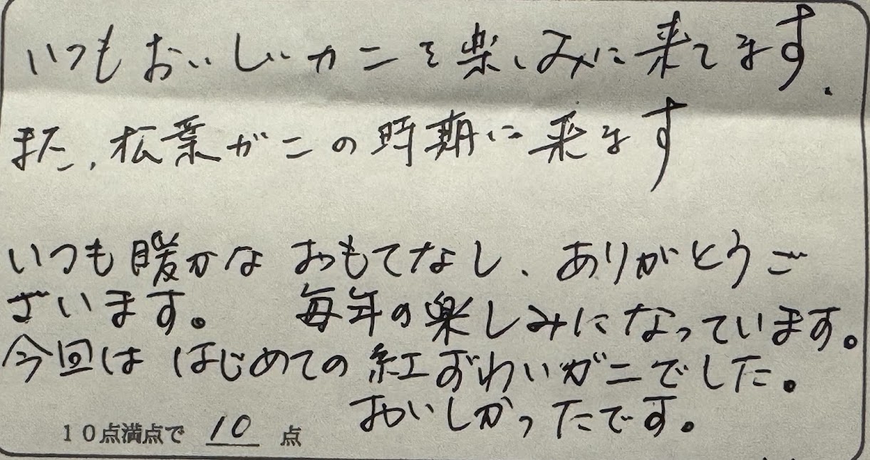 いつもおいしいカニを楽しみに来てます。 また、松葉ガニの時期に来ます。いつも暖かなおもてなし、ありがとうございます。毎年の楽しみになっています。 今回ははじめての紅ずわいガニでした。おいしかったです。(愛媛県Y様 大人の親子旅 2025.11.3. 50歳以上の方、女性にオススメ。 “香住ガニ2はいフルコース”)