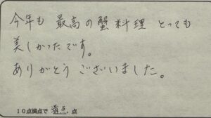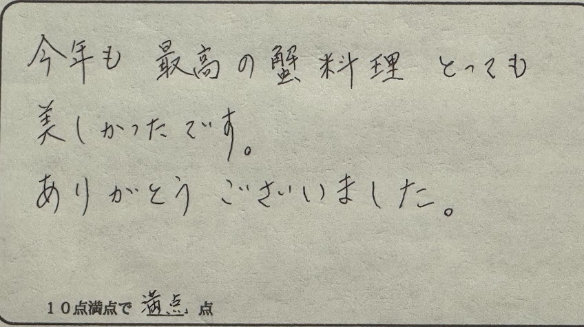 S様。いつも民宿美味し宿かどやをご利用いただきまして、誠にありがとうございます。毎年、この時期にお越しいただけること、大変嬉しく思います。お天気も良く、良いカニが入手できました♪これからも「最高の蟹料理」が出せるよう頑張ります!!来シーズンもまたのお越しをお待ちしております。ありがとうございました。