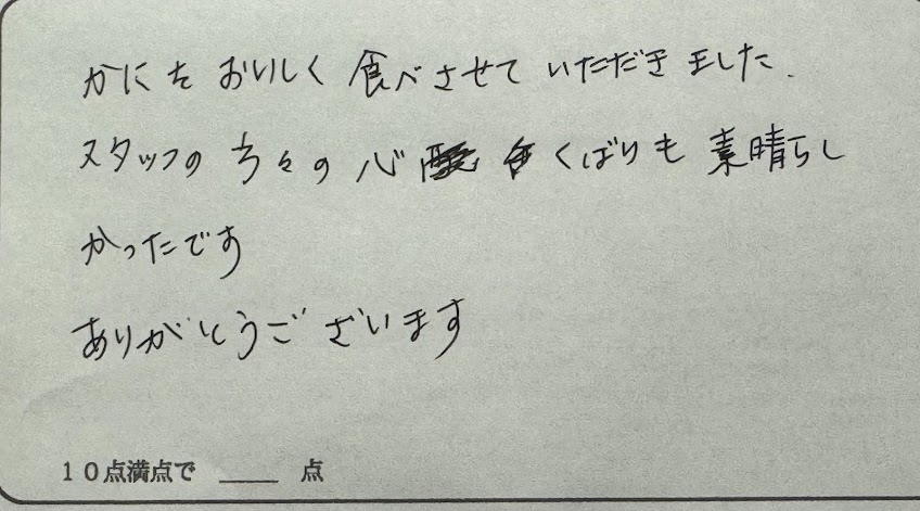 Y様。この度は民宿美味し宿かどやをご利用いただきまして、誠にありがとうございました。カニ解禁直後の香住、特に甲羅みその炭火焼きがイチオシでしたが、ご堪能いただけましたでしょうか。カニが食べたくなったら、ぜひ民宿かどやを思い出して下さいね。またのお越しをお待ちしております。ありがとうございました。