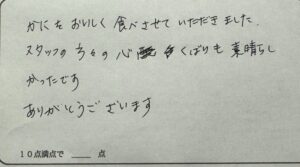 Y様。いつも民宿美味し宿かどやをご利用いただきまして、誠にありがとうございます。今回は三世代、ご家族の皆様でお越しいただき、ありがとうございます!!今シーズンも当館にてカニをご堪能いただけたこと、新たなメンバー(ご家族)でお越しいただけたことも大変嬉しく思います。カニを堪能できる定宿として、引き続きご愛顧の程、よろしくお願いします。またのお越しをお待ちしております。ありがとうございました。