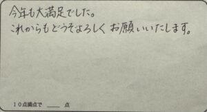 F様。いつも民宿美味し宿かどやをご利用いただきまして、誠にありがとうございます。海況が安定していて年末相場になる前のこの時期。特選柴山がにプランをご賞味いただくのに最も適した時期かと思います。今回も良いカニをお出しできたと自負しております。早くも来シーズンもご検討いただけるとのこと。引き続きよろしくお願いします。またのお越しをお待ちしております。ありがとうございました。