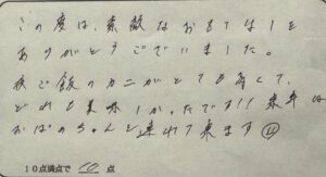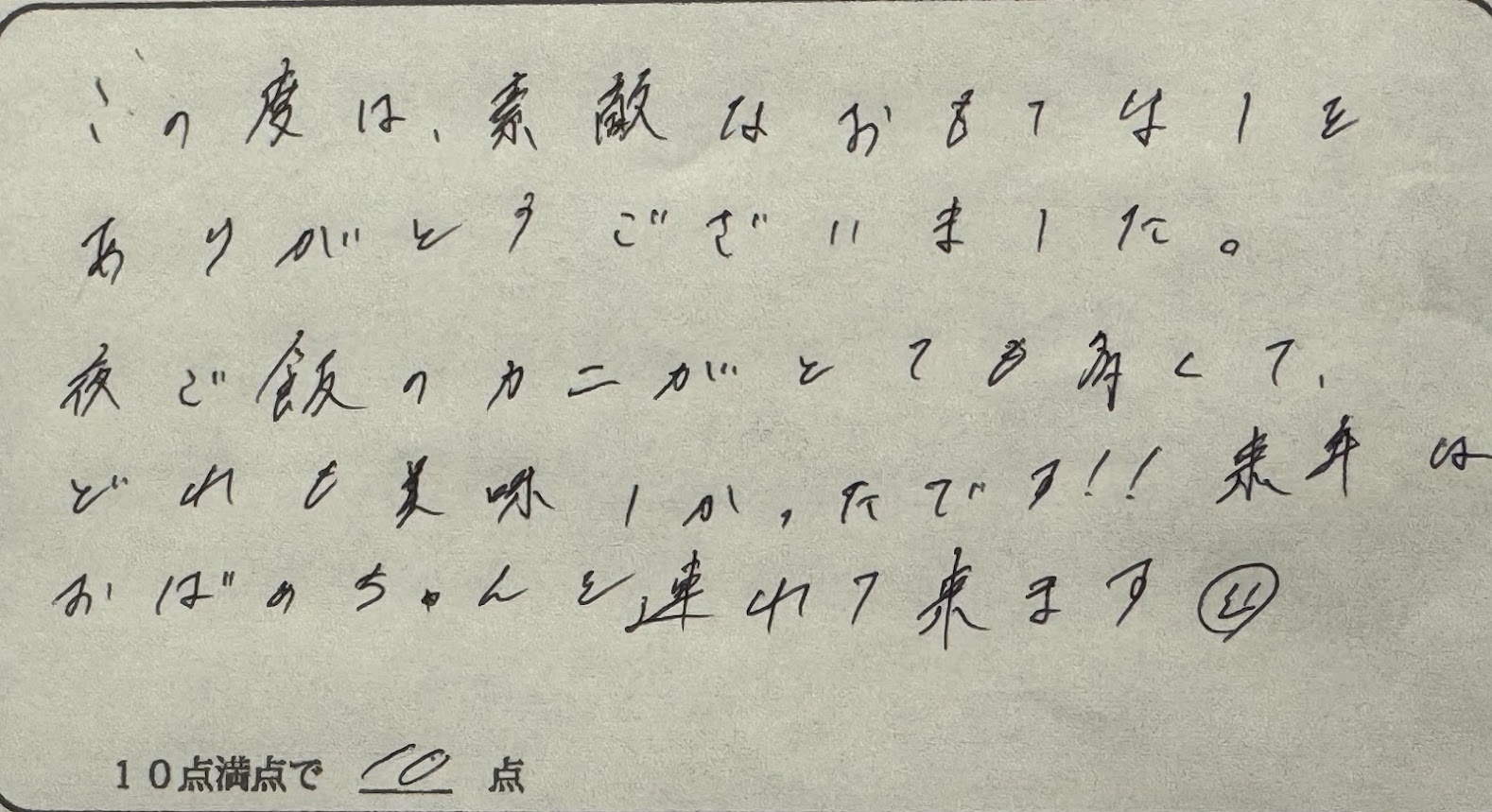 K様。この度は民宿美味し宿かどやにご来館いただきまして、誠にありがとうございました。ご家族でのカニ旅行でかどやをお選びいただき、ご満足していただけたようでとても嬉しいです。ゆでガニ付きのプランでしたので、ボリュームはかなりあったと思います。お腹いっぱい食べたい時は、ぜひまた民宿かどやへお越し下さいね。またのお越しをお待ちしております。ありがとうございました。
