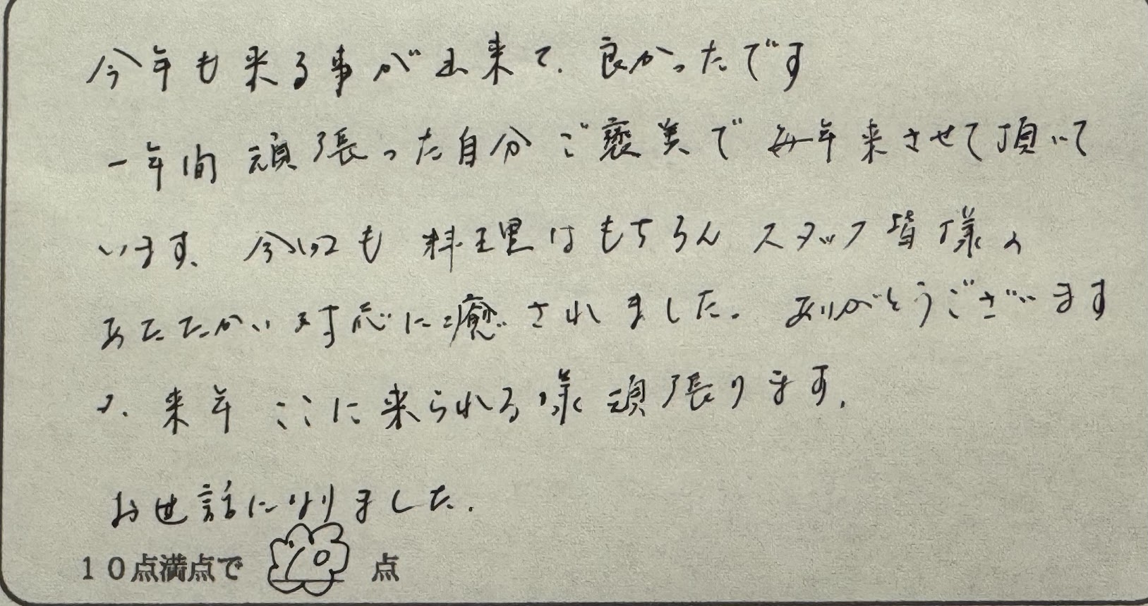 今年も来る事が出来て、良かったです。一年間頑張った自分ご褒美で毎年来させて頂いています。今回も料理はもちろんスタッフ皆様のあたたかい対応に癒されました。ありがとうございます。来年ここに来られる様頑張ります。お世話になりました。(香川県K様 ご夫婦2組旅行 2025.11.13. ぷりっぷり食感☆活柴山かにの刺身付!“いい旅プラン 基本P”<香住>)