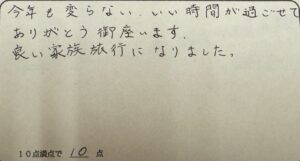 T様。いつも民宿美味し宿かどやをご利用いただきまして、誠にありがとうございます。今シーズンもお越しいただけたこと、とても嬉しいです。毎年お越しいただいていると、特別目新しいことはないかもしれませんが、それが安心感、”いつもの感じ”担っていただけると幸いです。引き続き来シーズンもお越しをお待ちしております。ありがとうございました。