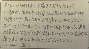 T様。この度は民宿美味し宿かどやをご利用いただきまして、誠にありがとうございました。この度は大勢の皆様でお越しいただき、楽しいひと時をお過ごしいただけたようで良かったです。”蟹を囲む”のは皆さんを笑顔にしてくれると思います。当館がそんな一助となればといつも思っています。今後もぜひ、皆さんで蟹旅行を企画して下さい。その際には当館にまたお越し下さいね。またのお越しをお待ちしております。ありがとうございました。