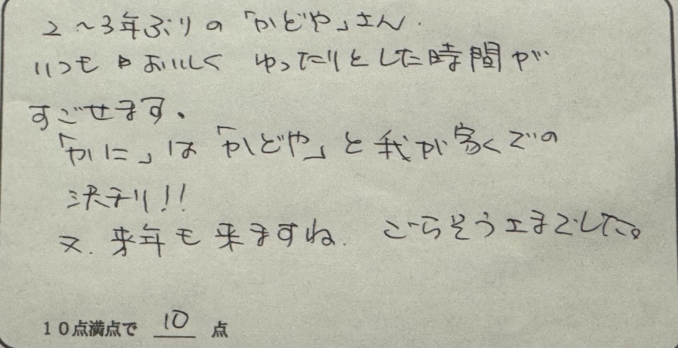 Y様。今回も民宿美味し宿かどやをご利用いただきまして、誠にありがとうございます。久しぶりのかどや、今回もご満足いただけたようで良かったです。今後ともぜひ、「帰ってきた」ような感じでくつろいで下さいね。引き続きそう思ってもらえるような場を美味しいカニと共に提供してまいりたいと思いますので。またのお越しをお待ちしております。ありがとうございました。