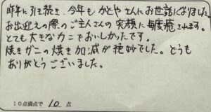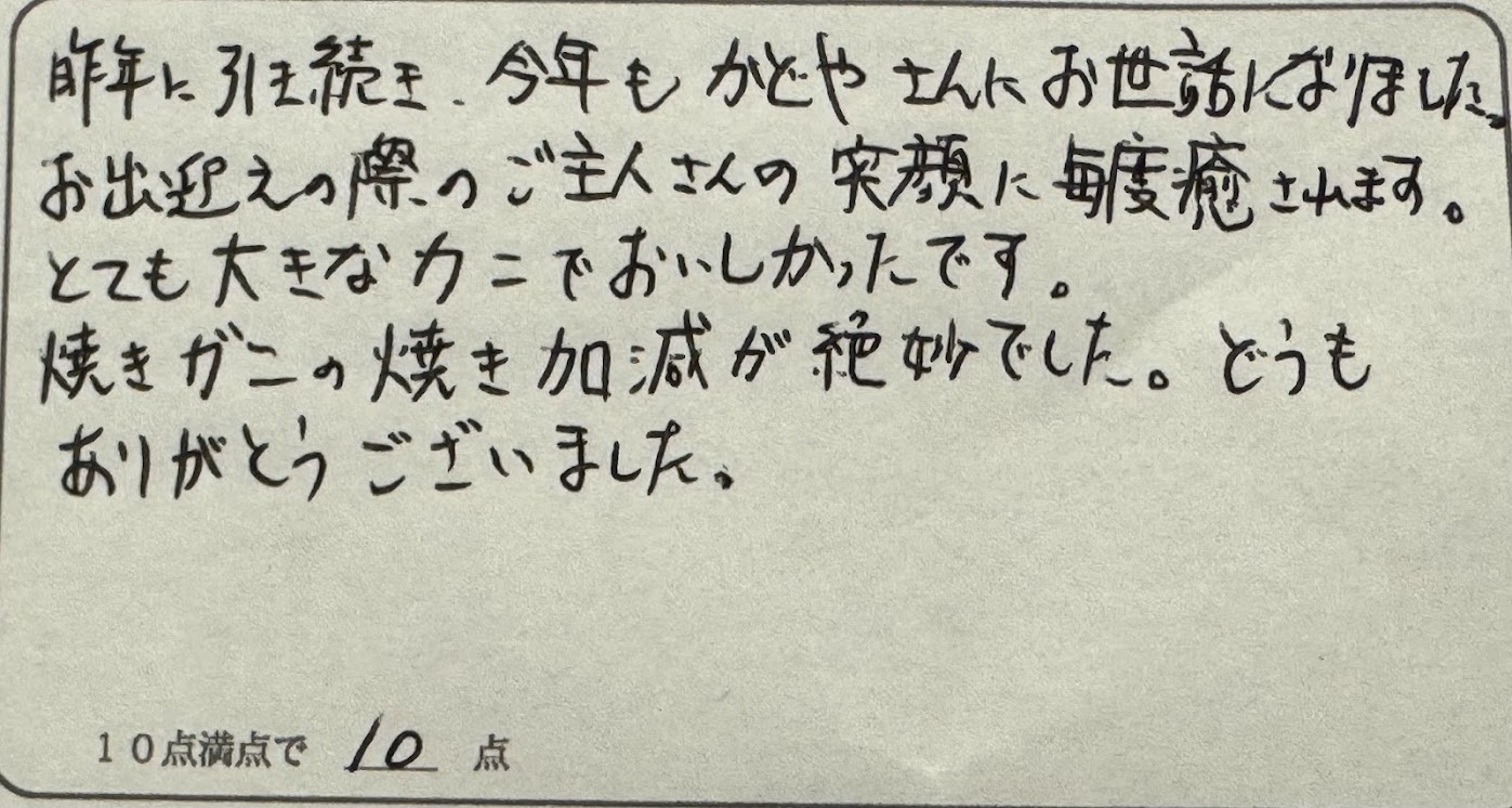 M様。この度は民宿美味し宿かどやへの二度目のご来館、誠にありがとうございます。今回は特選柴山がにプランの中でも特に大きなカニが仕入れられました。気候が冬型に変わる直前、11月中頃の今だからこそです。炭火での焼きガニを堪能していただけたのではないでしょうか。今ぐらいの時期がいちばんのオススメです。ぜひ来シーズン以降も特選プランをご賞味下さいね。