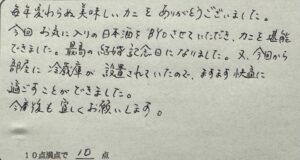 S様。いつも民宿美味し宿かどやをご利用いただきまして、誠にありがとうございます。今回は結婚記念日でのご利用ありがとうございます!!カニ三昧の記念日をお手伝いできて、大変嬉しく思います。BYOについては柔軟に対応させていただいておりますので、ぜひまたご利用下さい。客室の冷蔵庫も喜んでもらえて良かったです。またのお越しをお待ちしております。ありがとうございました。