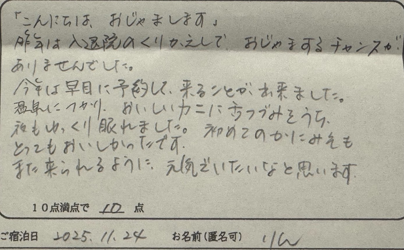こんにちは、おじゃまします。昨年は入退院のくりかえしで、おじゃまするチャンスがありませんでした。今年は早目に予約して、来ることが出来ました。 温泉につかり、おいしいカニに舌つづみをうち、 夜もゆっくり眠れました。初めてのかにみそもとってもおいしかったです。また来られるように、元気でいたいなと思います。(大阪府りん様 大人の親子旅 2025.11.24.  ぷりっぷり食感☆活柴山かにの刺身付!“いい旅プラン 基本P”<香住>)