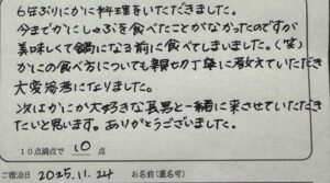 6年ぶりにかに料理をいただきました。今までかにしゃぶを食べたことがなかったのですが美味しくて鍋になる前に食べてしまいました。(笑) かにの食べ方についても親切丁寧に教えていただき大変参考になりました。次はかにか大好きな長男と一緒に来させていただきたいと思います。ありがとうございました。(兵庫県N様 ご夫婦旅行 2025.11.24 ぷりっぷり食感☆活柴山かにの刺身付!“いい旅プラン 基本P”<香住>)
