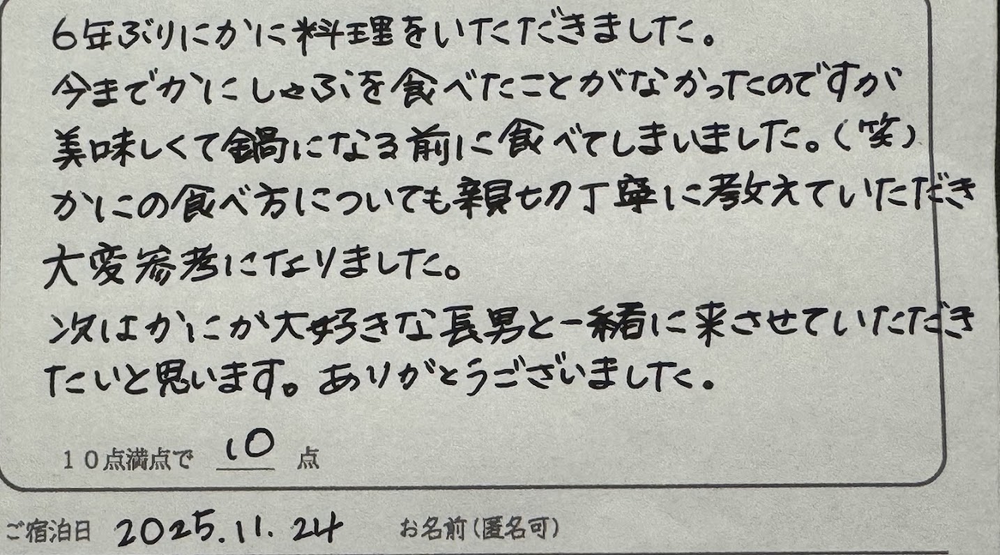 H様。この度は民宿美味し宿かどやをご利用いただきまして、誠にありがとうございした。カニはしゃぶしゃぶにしていただくとたくさん食べられる、という方が多いです。お腹いっぱいお召し上がりいただけたでしょうか。食べる回数が増えれば増えるほど食べる速度が向上するのもカニ料理の特徴です。ぜひぜひまたご家族の皆さんでお越しいただき、かにを食べるのが得意になって下さいね。またのお越しをお待ちしております。ありがとうございました。