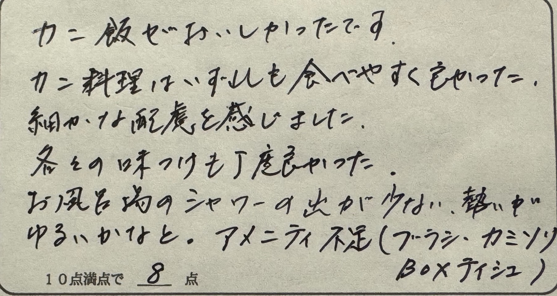 H様。この度は民宿美味し宿かどやをご利用いただきまして、誠にありがとうございした。カニ料理、ご満足いただけたようで良かったです。朝食のカニ飯は当館の名物でもあり、ご好評いただいている一品です。今後もご愛顧いただけましたら幸いです。ボックスティッシュや鏡等は、テレビ台下に全て入っておりました。説明不足で申し訳ありません。またアメニティも、現在は希望いただくとフロントにてお渡しさせていただいております。フロントの張り紙が見づらかったかもしれません。こちらも重ねて申し訳ありませんでした。全てのアメニティが提供できるわけではありませんが、カミソリやシャワーキャップ等ご用意できるものもございますので、気軽にお申し付け下さい。