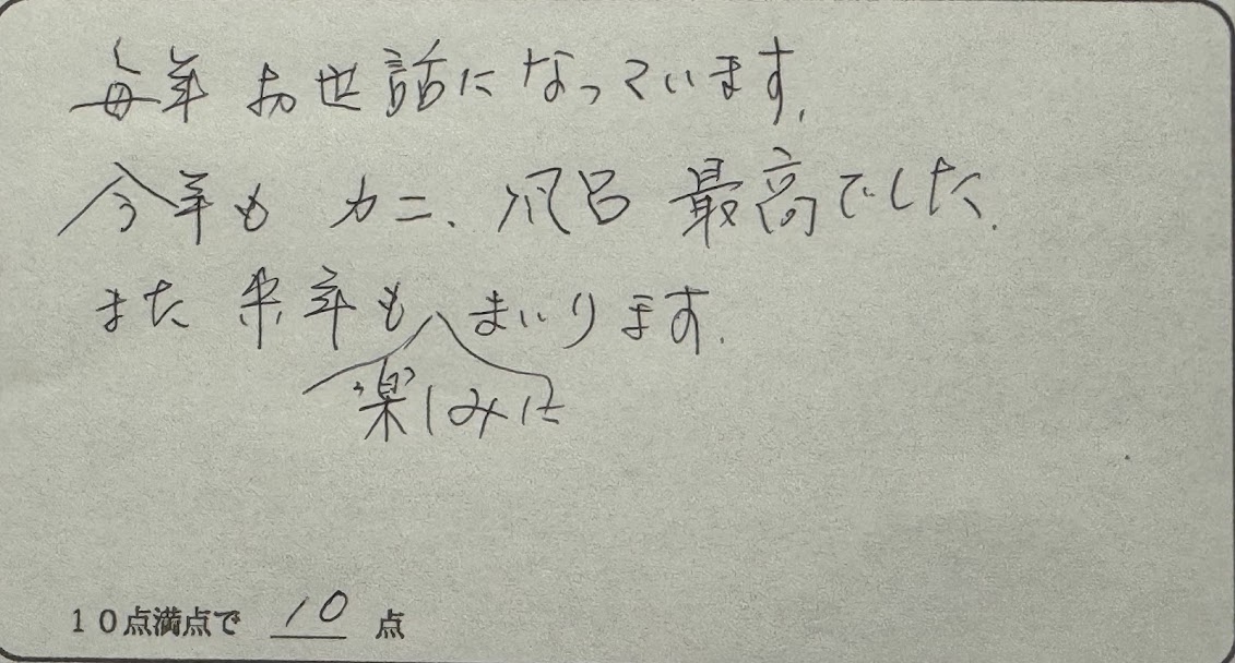 F様。いつも民宿美味し宿かどやをご利用いただきまして、誠にありがとうございます。今シーズンもカニと温泉を満喫していただけたようで良かったです。今年は今のところカニも豊漁で、良いカニを提供できていると自負しています。来年もこんな感じでカニが安定して仕入れられることを期待しています。またのお越しをお待ちしております。ありがとうございました。