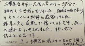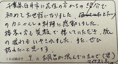 千葉県白井市に在住の方からの紹介で初めてお世話になりました、聞いていた通りのカニづくしの料理に感動しました。 接客の方も笑顔で接していただき、旅の疲れもいやされました。また、ぜひ訪れたいと思います。お風呂が混んでいたので(男)マイナス1点。(千葉県Y様 ご夫婦旅行 2025.11.27. ぷりっぷり食感☆活柴山かにの刺身付!“いい旅プラン 基本P”<香住>)