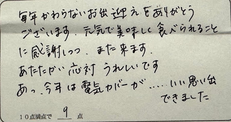 H様。いつも民宿美味し宿かどやをご利用いただきまして、誠にありがとうございます。今年もありがとうございます!!今年は豊漁ということもあり、かにみそたっぷりの甲羅焼をご賞味いただけたのではないかと思います。電気カバーの件は失礼しました。ハプニングにもめげず?!、引き続きお越し下さいね。来シーズンもお越しをお待ちしております。ありがとうございました。