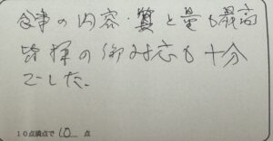 M様。この度は民宿美味し宿にご来館いただきまして誠にありがとうございした。当館のカニ料理、気に入っていただけてありがとうございます!!皆様でお集まりの際にはぜひ、当館へのカニ旅行をまた企画していただけると嬉しいです。あるいは、ご家族やご友人同士でのカニ旅行を検討される際にも香住を、かどやを思い出していただけると幸いです。またのお越しをお待ちしております。ありがとうございました。