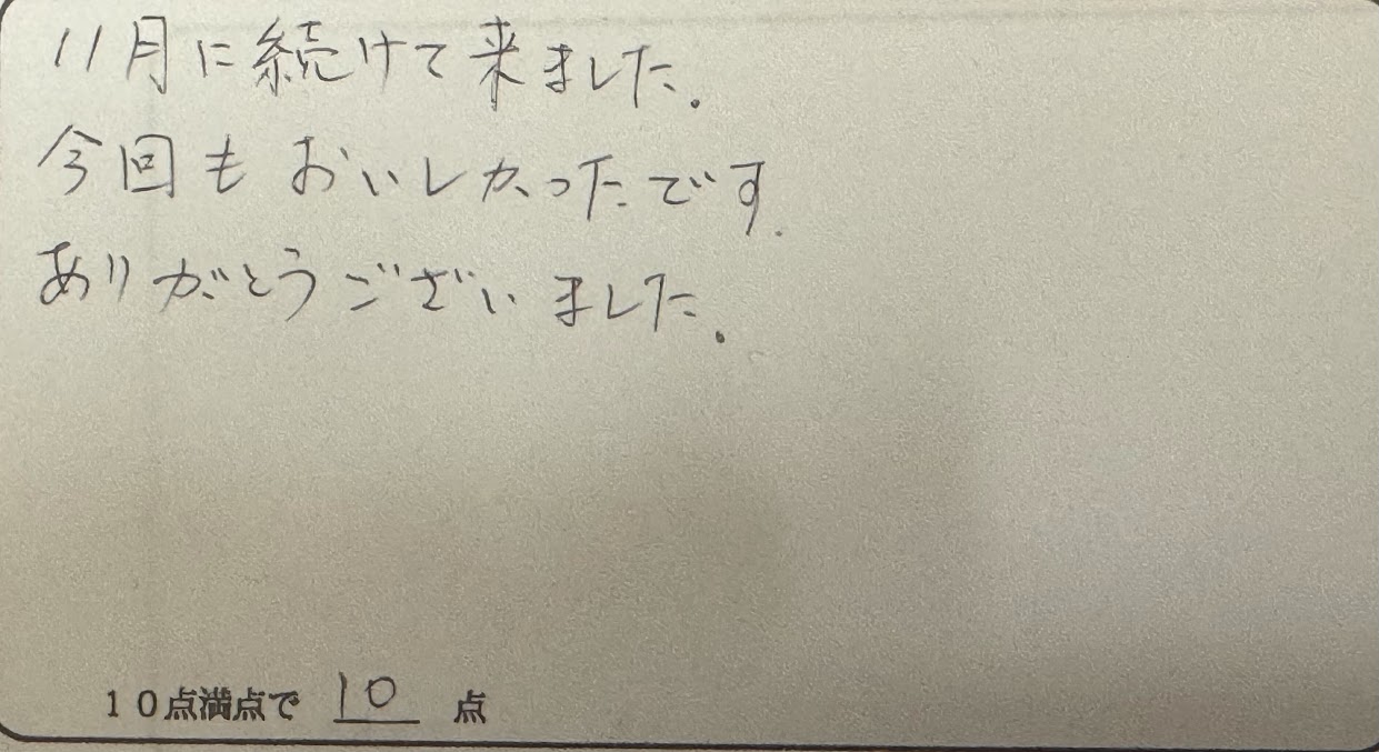 11月に続けて来ました。今回もおいしかったです。ありがとうございました。