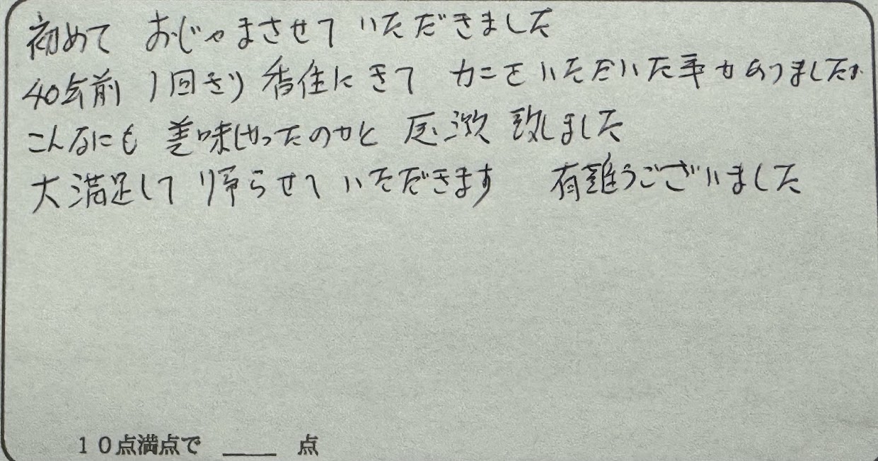 初めておじゃまさせていただきました。40年前1回きり香住にきてたをいただいた事もありましたが、こんなにも美味やったのかと感激しました。大満足して帰らせていただきます。有難うございました。