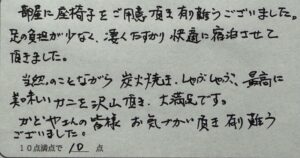 M様。いつも民宿美味し宿かどやをご利用いただきまして、誠にありがとうございます。今回もカニ三昧、楽しんでいただけたようで良かったです。階段が急な構造でご不便をおかけいたします。せめて、客室内では快適にお過ごしいただけたらと思います。できる範囲の対応はさせていただきますので、引き続きよろしくお願いします。来年もお待ちしております。ありがとうございました。