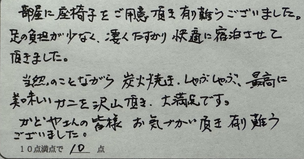 部屋に座椅子をご用意頂き有り難うございました。 足の負担が少なく、凄くたすかり快適に宿泊させて頂きました。当然のことながら炭火焼き・しゃぶしゃぶ、最高に美味しいカニを沢山頂き、大満足です。かどやさんの皆様、お気づかい頂き有り難うございました。(大阪府M様 ご夫婦旅行 2025.12.5. ぷりっぷり食感☆活柴山かにの刺身付!“いい旅プラン 基本P”<香住>)