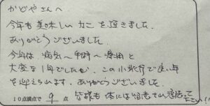 かどやさんへ。今年も美味しいカニを頂きました。ありがとうございました。今年は、病気~手術~療用と大変な1年でしたか、この小旅行で良い年を迎えられます。ありがとうございました。皆様も体には留意され、頑張って下さい!!