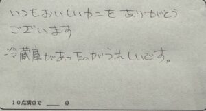 いつもおいしいカニをありがとうございます。冷蔵庫があったのがうれしいです。