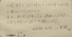 K様。この度は民宿美味し宿かどや3年連続でのご来館、誠にありがとうございます。当館の提供させていただくカニ料理、気に入っていただけてとても嬉しいです。次回はご家族の皆様全員でお越しいただける計画とのこと。楽しみにしています。年末恒例行事としてのカニ旅行。今後是非是非お願いしたします。美味しいカニをご用意してお待ちしておりますね。またのお越しをお待ちしております。ありがとうございました。