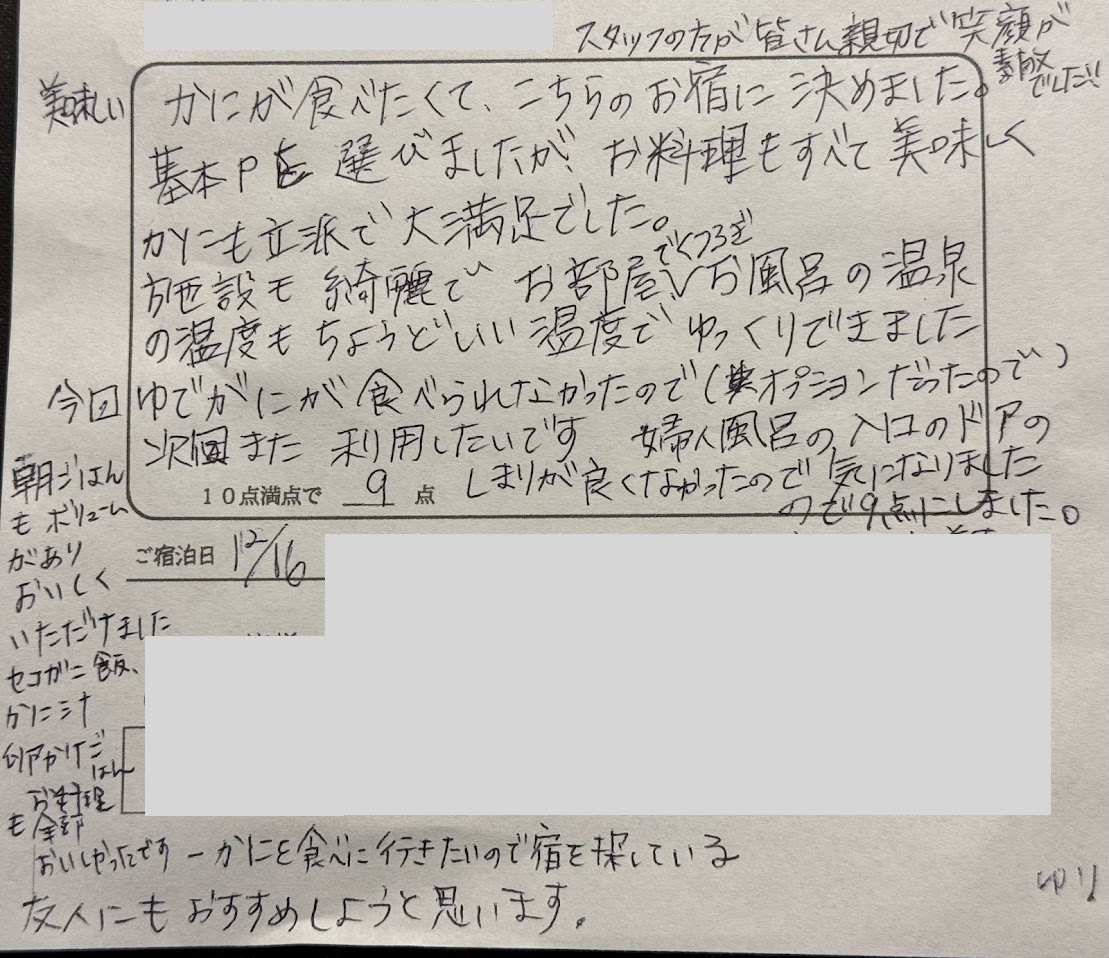 K様。この度は民宿美味し宿かどやをご利用いただきまして、誠にありがとうございました。カニ料理、朝食共にご満足いただけたようで良かったです。毎日頑張って清掃しておりますが、古い家屋でございますので、建て付けがやや不十分なところが出てきております。申し訳ございません。その分、お料理やおもてなしで精一杯ご満足いただけるようこれからも頑張ります。またのお越しをお待ちしております。ありがとうございました。