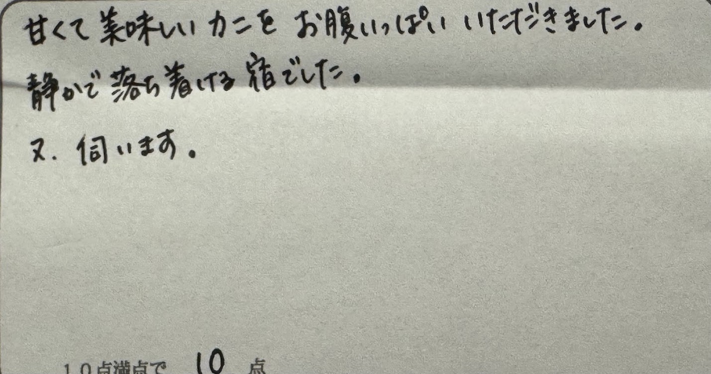 T様。この度は民宿美味し宿かどやをご利用いただきまして、誠にありがとうございました。海辺の田舎町だからこその雰囲気と共にご賞味いただくカニ料理をお楽しみいただけて良かったです。ぜひまたこの雰囲気をカニ料理と共にお楽しみ下さいね。またのお越しをお待ちしております。ありがとうございました。