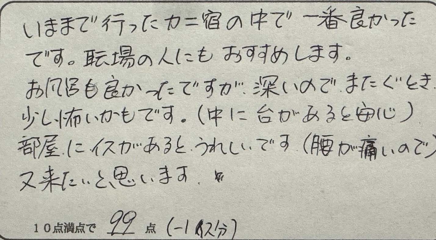 N様。この度は民宿美味し宿かどやをご利用いただきまして、誠にありがとうございました。カニ料理、ご満足いただけたようで良かったです。近年のバリアフリー構造には追いつかない古い構造の家屋ですが、その分、美味しいお料理を引き続き提供してまいりたいと思います。なお、椅子は階段上がってすぐの所にセルフでお持ちいただける折りたたみ和椅子がございました。備品などの提供がより伝わるような工夫を今一度見直してまいりたいと思います。ご意見ありがとうございます。またのお越しをお待ちしております。ありがとうございました。