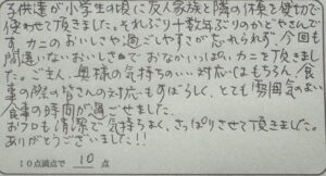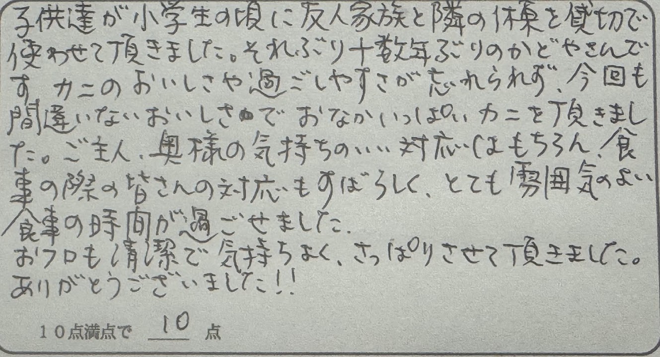 M様。この度は民宿美味し宿かどやを久しぶりにご利用いただきまして、誠にありがとうございました。別館はコロナ禍で休止させていただいたので、コロナ前ぶりにお越しいただいたんですね。覚えておいていただき、ありがとうございます。気持ちよくお過ごしいただけたとのこと。これを機にぜひ、来シーズン以降もお越し下さいませ。美味しいカニをご用意してお待ちしております。ありがとうございました。
